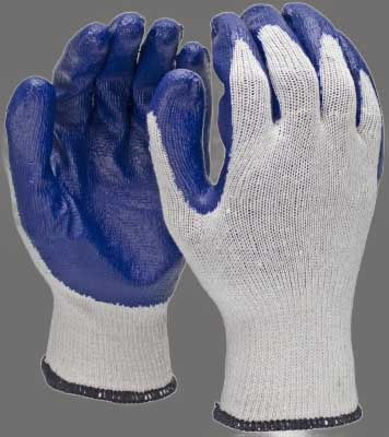 Latex Palm Gloves. Polyester/Cotton blend. Premium blue latex on fingers and palms with crinkled grip. Knit wrist with hem.